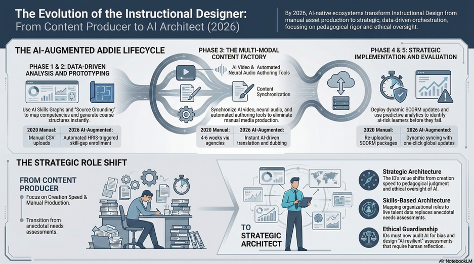 Tone and framing: Professional, strategic, and analytical throughout. Position the instructional designer as a strategic learning architect who directs and orchestrates AI systems rather than being replaced by them. Emphasize the shift from content delivery to strategic value creation."